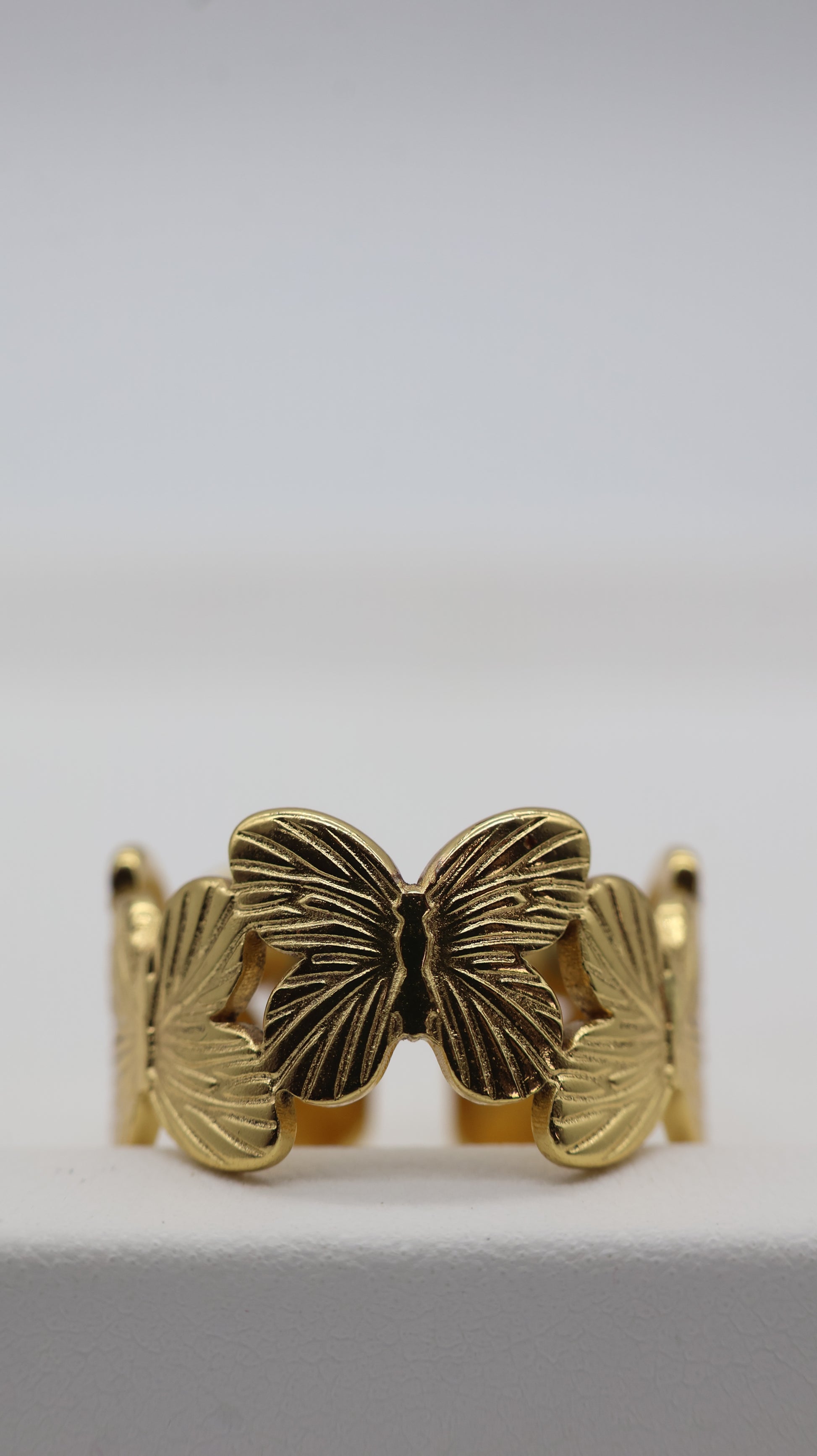 This Golden Butterfly Statement Ring features intricately engraved wings with delicate texture detailing that catches the light beautifully. Designed in a rich gold finish, the layered butterfly silhouette wraps gracefully around your finger, creating a bold yet feminine statement.