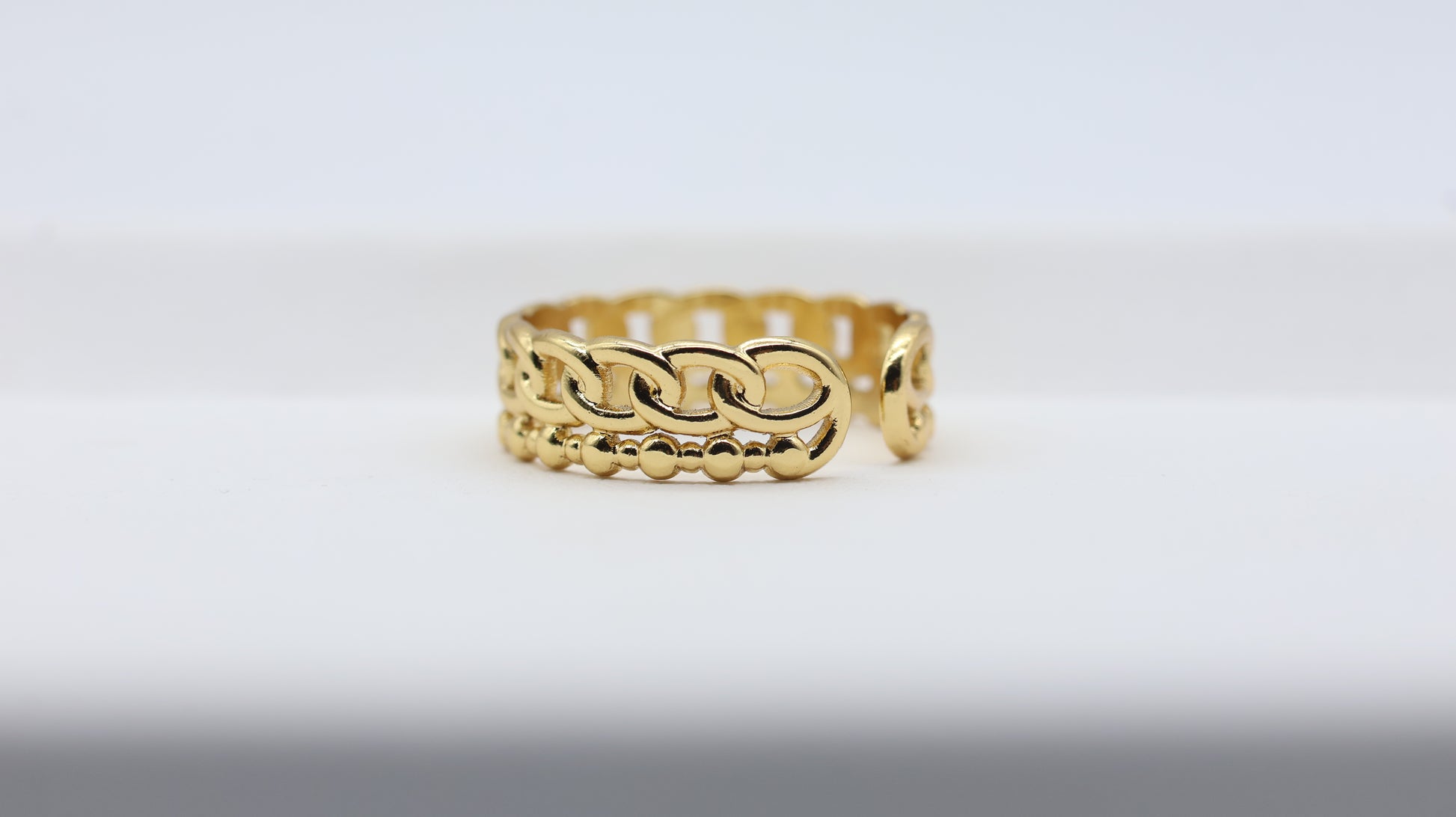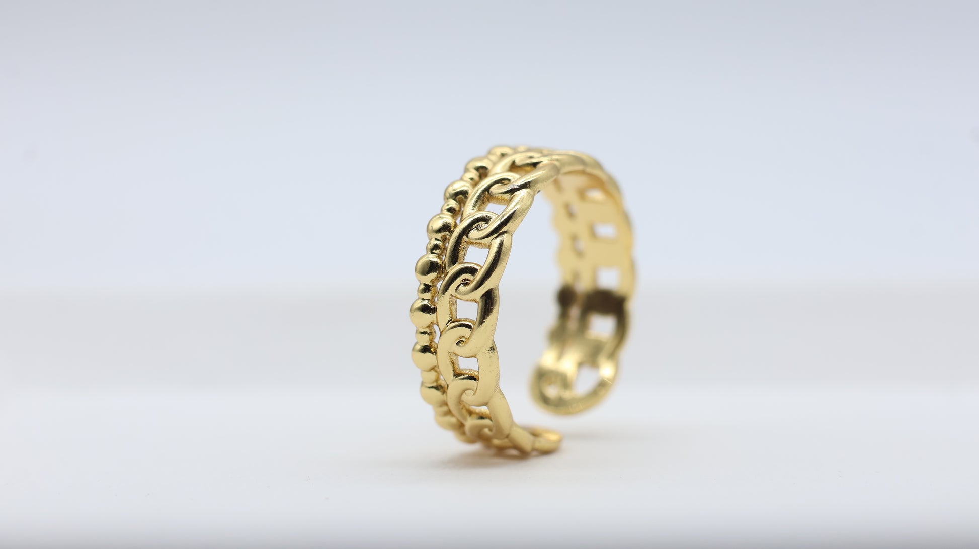 This gold chain statement ring for women features a layered design with a sleek interlocked chain band on top and delicate gold beaded detailing at the base. The dual-layer look gives it a stacked ring vibe — without actually stacking.